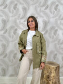 Giacca oversize dallo stile deciso e ricercato, perfetta per aggiungere carattere ai look di stagione. Realizzata in cotone strutturato color verde oliva, unisce praticità e dettagli decorativi dal fascino etnico-boho. Il modello presenta colletto classico, chiusura frontale con bottoni a pressione e tasche applicate. La vestibilità ampia con spalla scesa garantisce comfort e un fit contemporaneo. Protagonisti del capo sono i ricami decorativi su schiena e maniche, con motivi paisley e dettagli a contrasto che donano personalità e rendono la giacca unica.