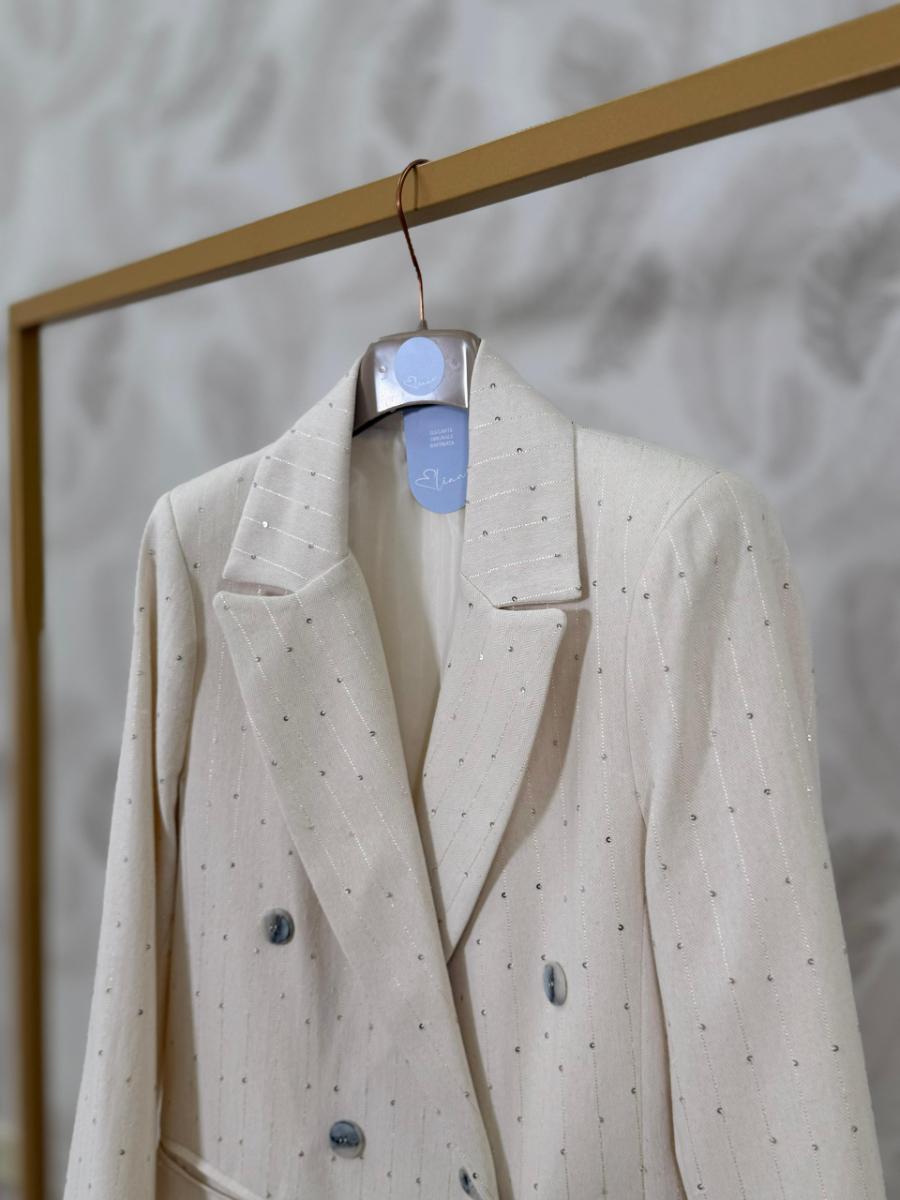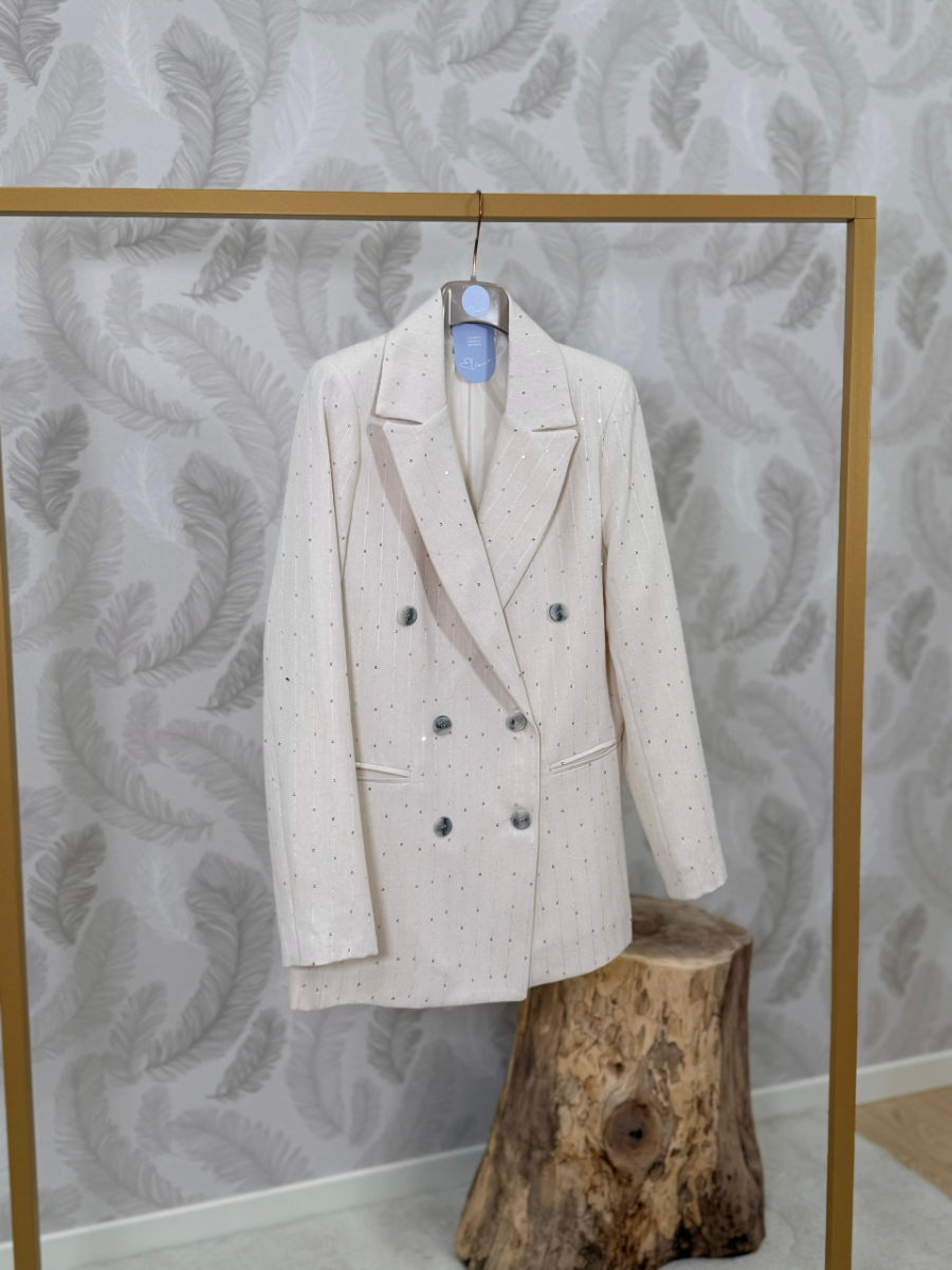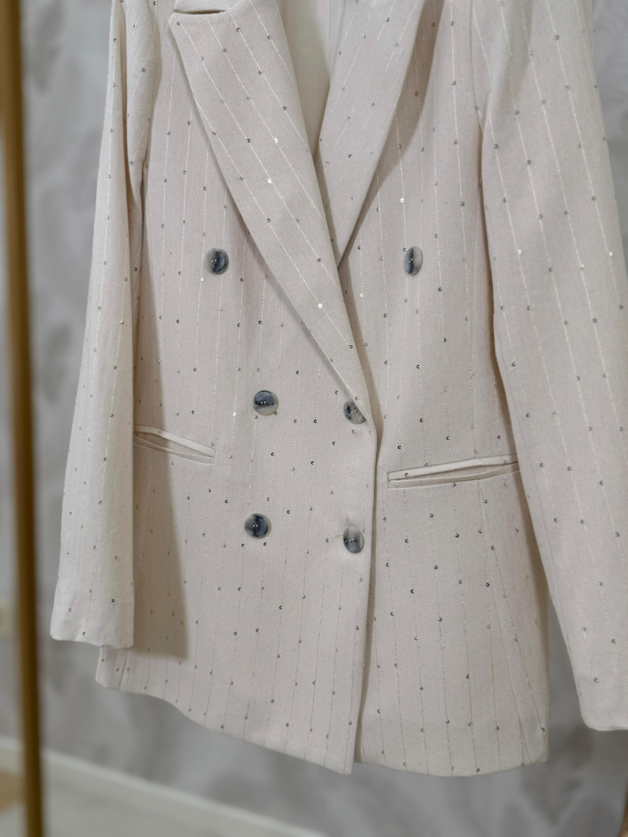 Blazer doppiopetto dal taglio sartoriale, pensato per chi desidera un look elegante con un tocco brillante e raffinato. Realizzato in tessuto chiaro con sottili righe verticali impreziosite da micro strass, dona luminosità discreta e valorizza la silhouette slanciando la figura.