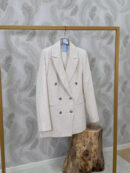 Il modello presenta revers classico, chiusura doppiopetto con bottoni gioiello, tasche a filetto e linea leggermente strutturata che definisce il punto vita mantenendo comfort e vestibilità impeccabile.