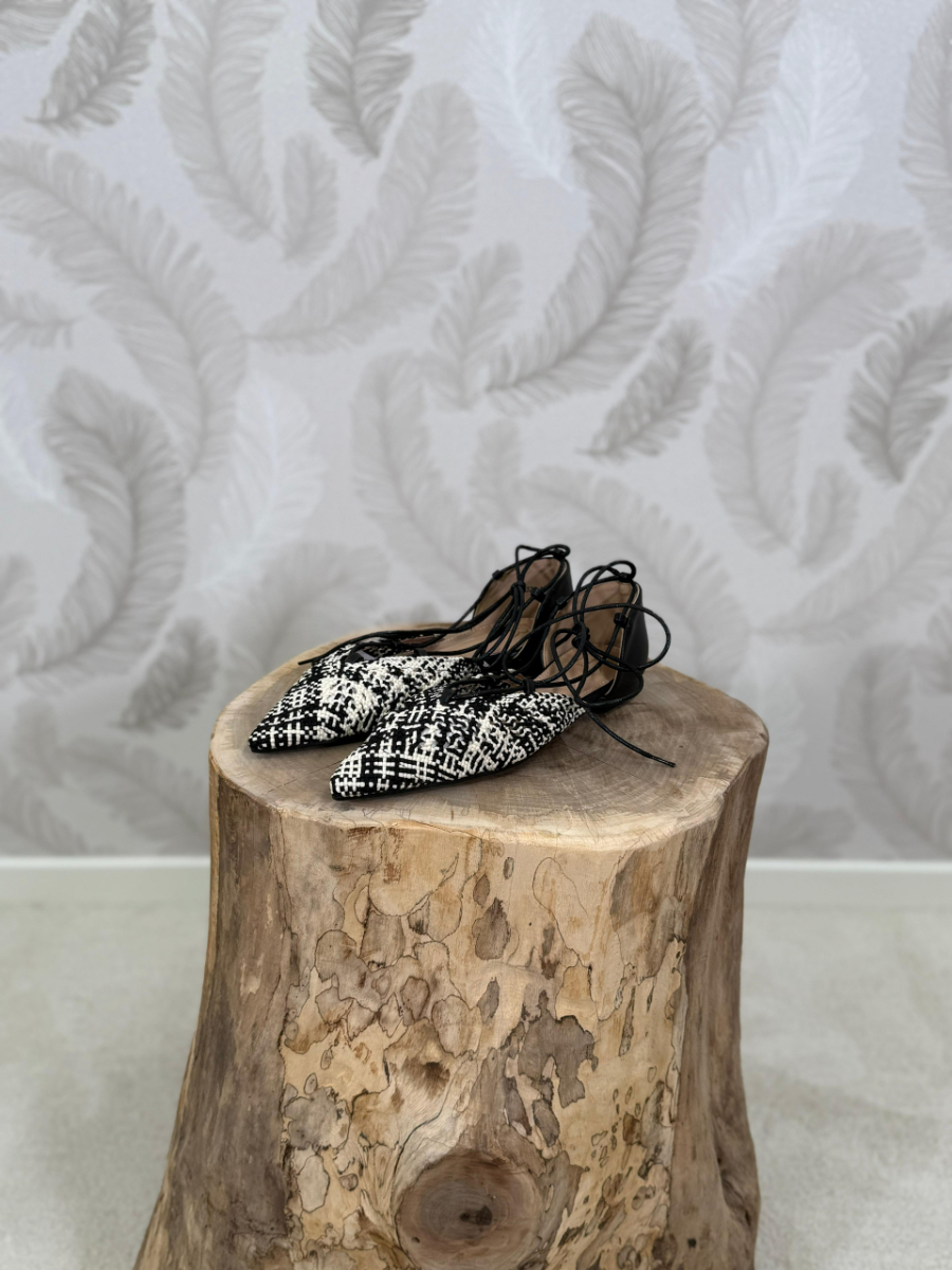Ballerina a punta dal design moderno e raffinato, perfette per aggiungere carattere ai tuoi look quotidiani. Il modello presenta una silhouette affusolata che slancia la figura, con tomaia in tessuto intrecciato bianco e nero dal motivo grafico elegante e contemporaneo. I lacci sottili avvolgono delicatamente la caviglia, creando un effetto femminile e sofisticato. Il retro in tonalità nera a contrasto dona struttura e un tocco deciso al design. Ideali da abbinare a pantaloni sartoriali, jeans o gonne midi per uno stile chic e attuale, perfette sia per il giorno che per la sera.